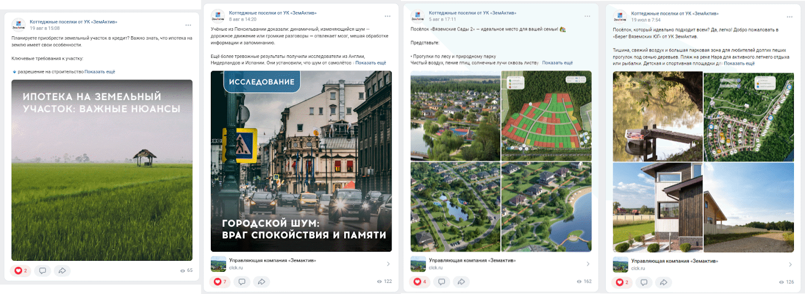 Важный акцент: До 40% контента — нативные упоминания конкретных предложений компании с прямым призывом изучить участки на сайте.