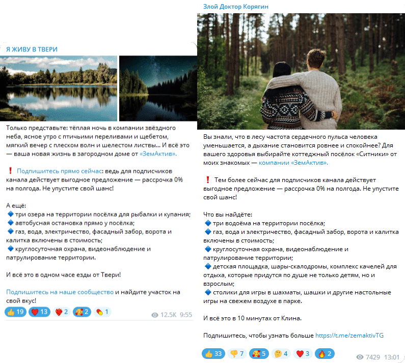Посевы в Telegram-каналах стали эффективным каналом. Наилучший отклик получили креативы с конкретными предложениями (площадь, стоимость участка), а не общие описания поселков. Выбирались тематические и региональные каналы, исключая шумные новостные паблики.