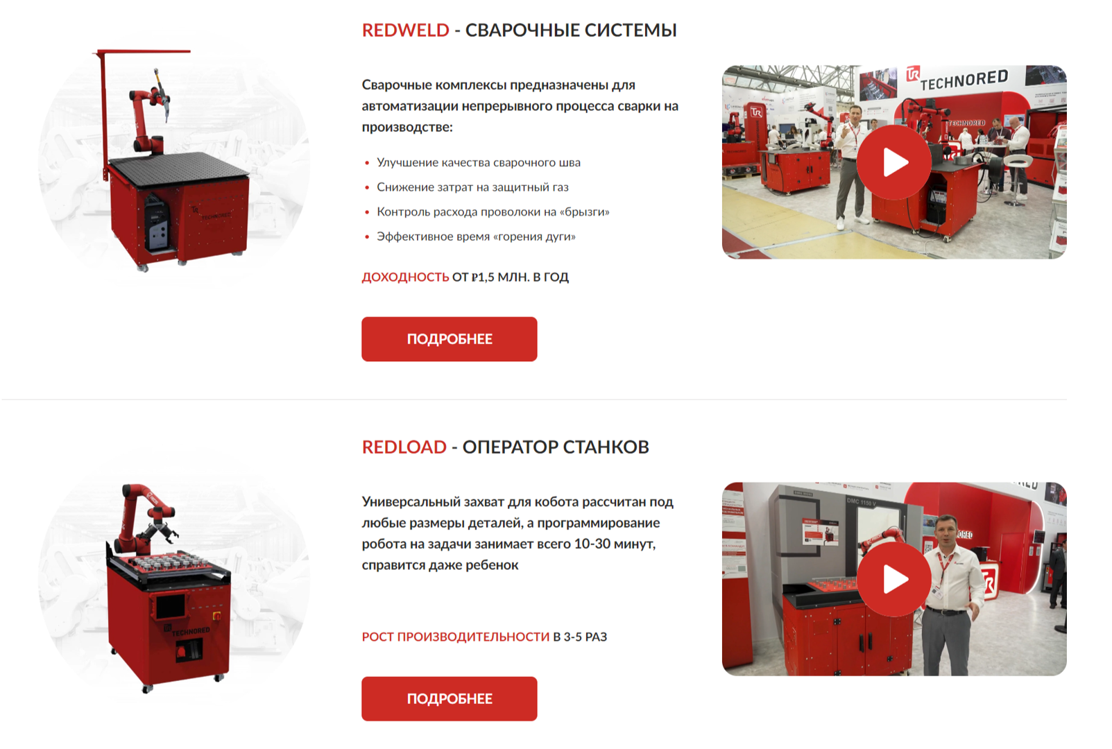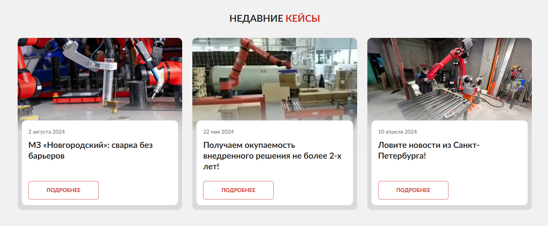 На сайт добавлен комплексный раздел, посвященный автоматизации производства. Здесь клиенты могут найти готовые решения для оптимизации сварочных систем, улучшения работы операторов станков и совершенствования систем укладки. Особенностью раздела стала интерактивная интеграция видео с YouTube, а каждое решение представлено на отдельной странице с уникальным дизайном.