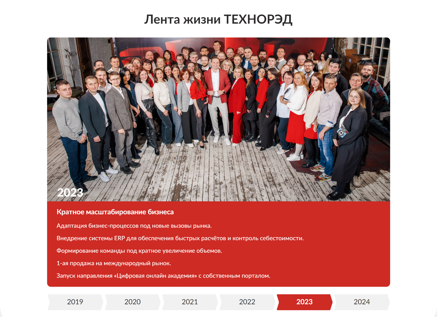 Специалисты агентства разработали дизайн-концепцию и контент для страницы «О компании», которая включает описание конкурентных преимуществ, информацию о команде и сертификаты. Дополнительно была создана «лента времени», наглядно демонстрирующая ключевые достижения компании по годам с момента основания.