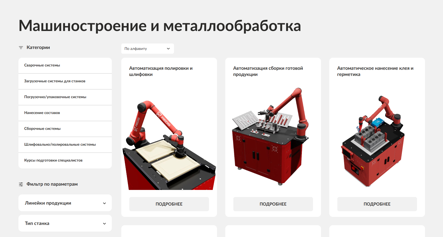 Была разработана страница каталога с интуитивно понятной системой фильтрации. Клиенты получили возможность персонализировать отображение товаров, выбирая нужную линейку продукции или задавая конкретные технические параметры, такие как тип станка, требуемая досягаемость и грузоподъемность.