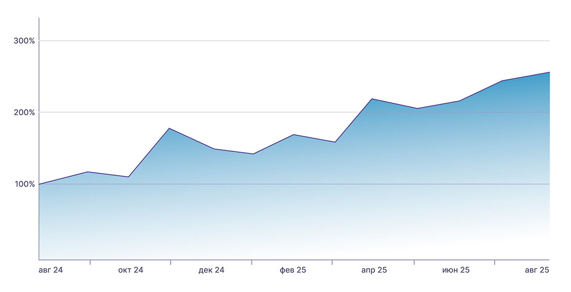 За год работы по комплексному продвижению сайта специалисты агентства добились роста поискового трафика в 2.2 раза. Все показатели представлены в относительном формате в соответствии с условиями соглашения о неразглашении (NDA).