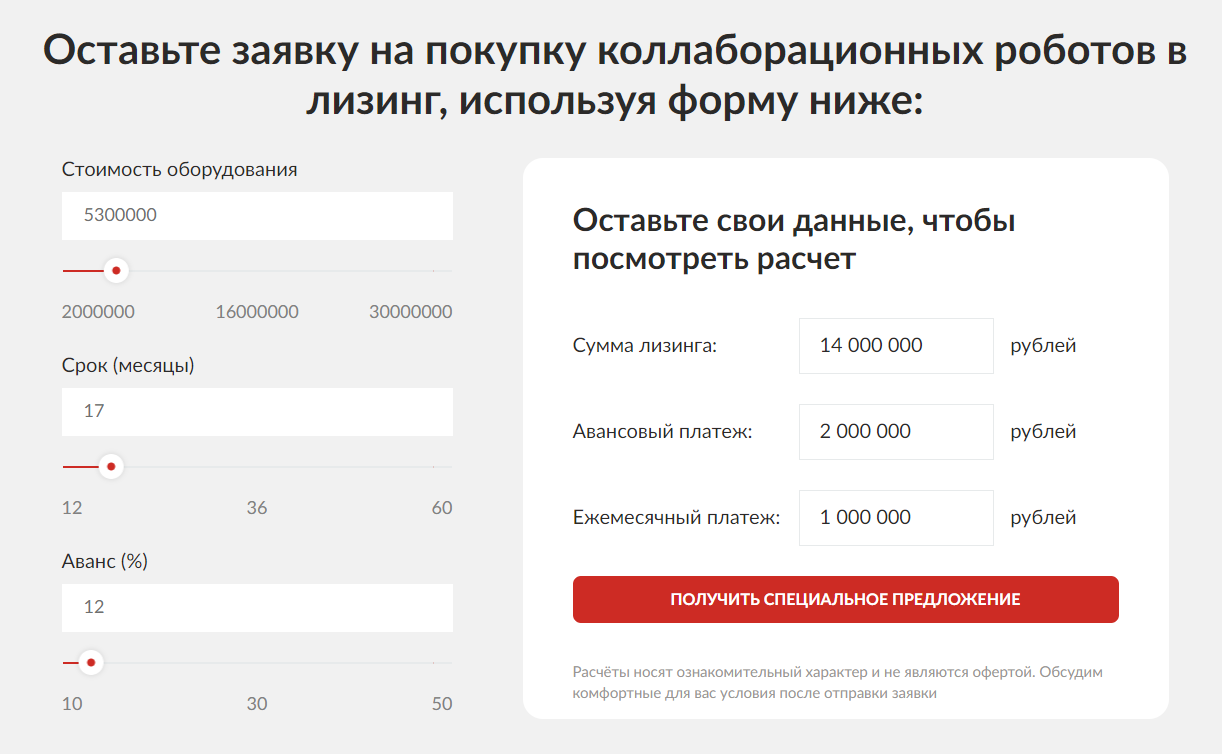 Специалисты агентства внедрили калькулятор лизинга промышленных роботов, который позволяет клиентам мгновенно рассчитать стоимость и условия рассрочки. После ввода контактных данных для подготовки индивидуального коммерческого предложения, заявка автоматически сохраняется в системе и передается в CRM Битрикс24 для оперативной обработки менеджерами.