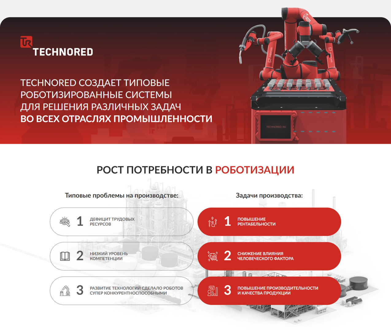 TECHNORED – надежный партнер в области инновационной автоматизации. Это динамично развивающаяся компания, которая не просто меняет рынок, но и создает действенные стратегии и выстраивает эффективную структуру для их реализации. Их специализация – доступные и гибкие решения для автоматизации производственных процессов в различных индустриях. TECHNORED признана одним из 9 самых успешных стартапов в сегменте «Engineering» по версии Inc.Russia.