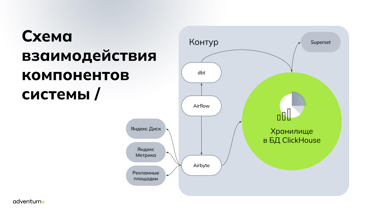 В рамках проекта данные собираются из множества внешних источников: рекламных кабинетов MyTarget, OK Ads, Tg Ads, VK Ads, а также из Яндекс Business, Яндекс Директа и Яндекс Дзена. Дополнительно подключена Яндекс.Метрика, а для хранения медиапланов и другой вспомогательной информации используется Яндекс.Диск. Все данные поступают во внутренний процессинг через коннекторы, где проходят обновление и обработку, а затем хранятся в ClickHouse. На выходе они визуализируются в Superset, предоставляя аналитикам, маркетологам и руководителям компании интерактивные отчеты с удобной навигацией.