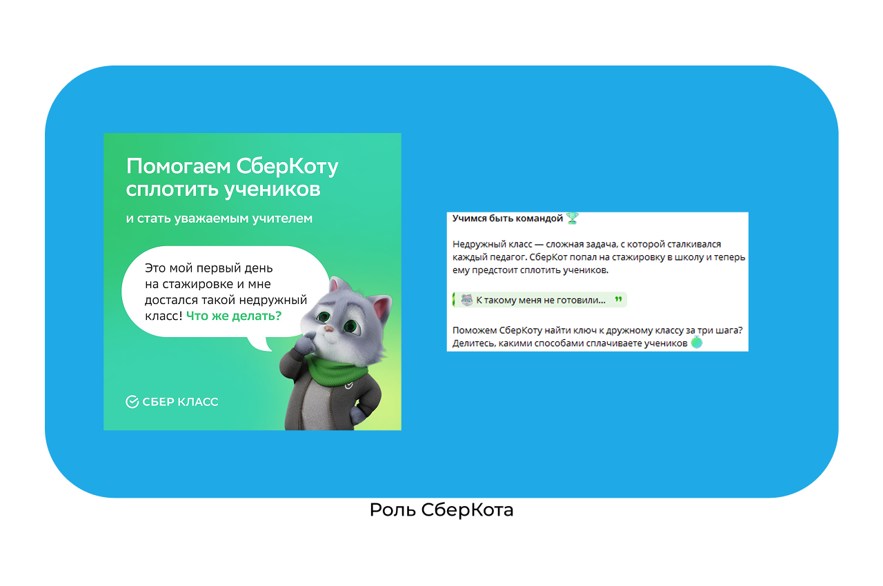 Ещё одной нетипичной задачей было интегрировать маскот бренда — СберКота. С ним шутят, рассказывают о зумерах и даже проходят стажировку в школе. По запросу заказчика персонаж должен дополнить не только карточки и истории, но и тексты. Встраивать его реплики в обычные посты было поначалу непросто, но SMMщики поймали вайб. Про Кусю тоже не забывают — начали знакомить аудиторию и с ней.