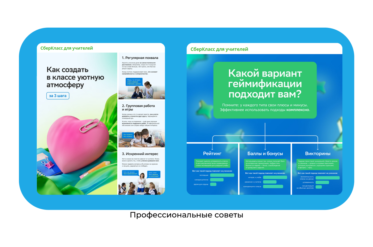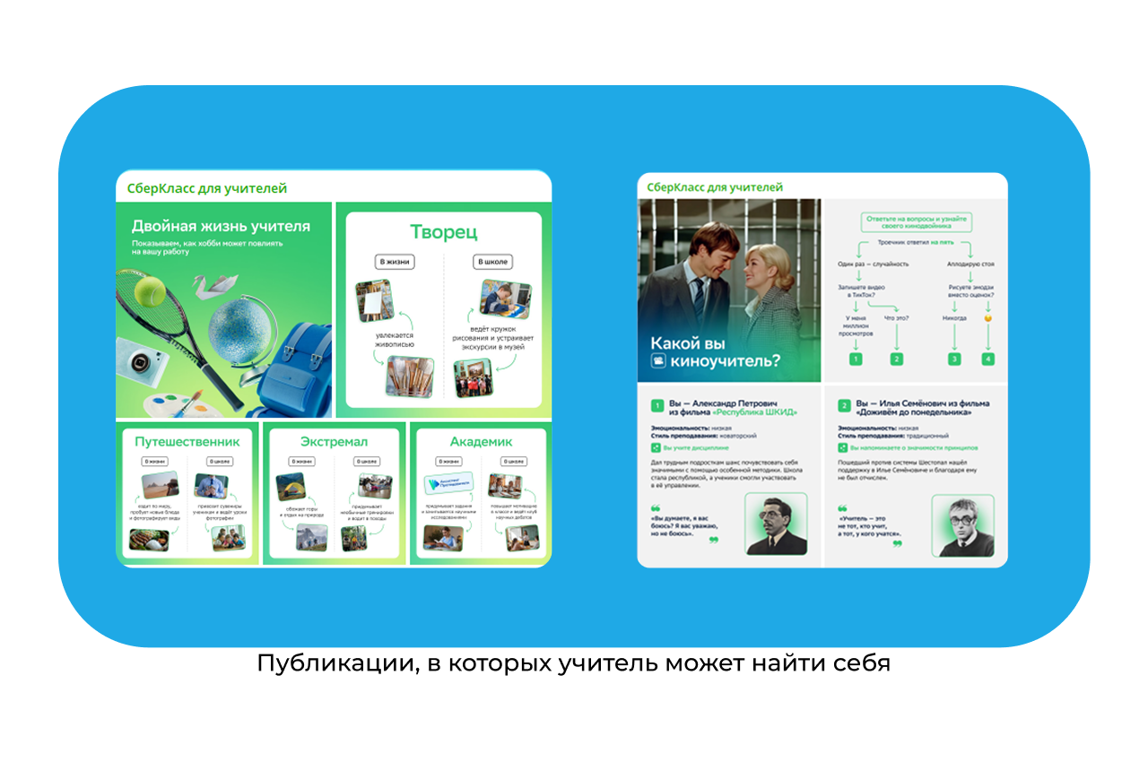 Практические рекомендации дополнили опытом аудитории: нашли учителей, которые активно читают канал СберКласса, и провели с ними интервью на профессиональные темы. Теперь привлекают педагогов регулярно!