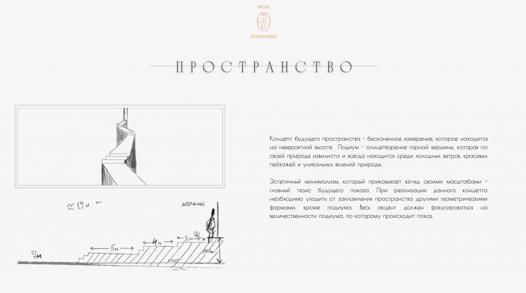 Концепт пространства – бесконечное измерение, которое находится на невероятной высоте. Подиум – олицетворение горной вершины, которая по своей природе извилиста и всегда находится среди холодных ветров, красивых пейзажей и уникальных явлений природы.