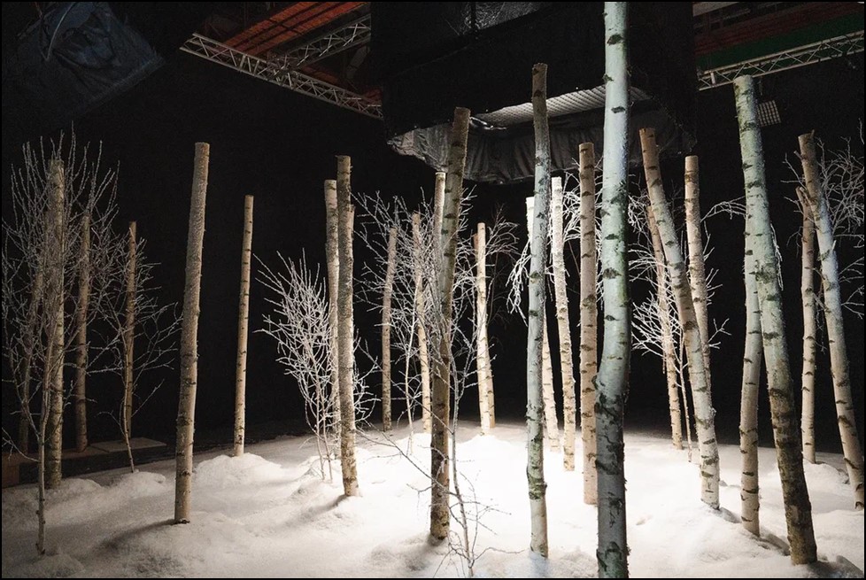 В кадре были реальные березы с умело созданным снегом и изморозью на ветках, что погрузило зрителя в атмосферу зимнего леса. Для того, чтоб быстро смонтировать все, что задумано, работали в павильоне с двумя циклорамами. В одной шла съемка, в другой монтаж.
