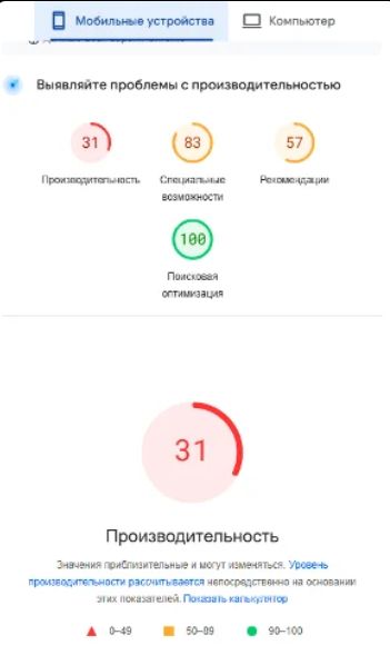 - Показатели PageSpeed Insights: мобильная версия — 31, десктоп — 29