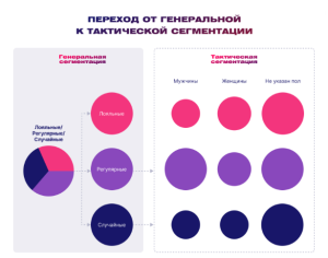 -Стратегия и генеральная сегментация отвечают на вопросы «Какие сегменты у нас есть?» и «Что с ними делать?». Тактическая сегментация отвечает на вопрос «Как это сделать?». Это инструмент для тестирования гипотез, экспериментов и поиска наиболее эффективных способов взаимодействия с клиентами.