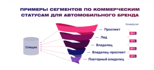Для клиентов автомобильной отрасли мы применили сегментацию по коммерческим статусам, соответствующим этапам жизненного цикла клиента. Сегменты включают: