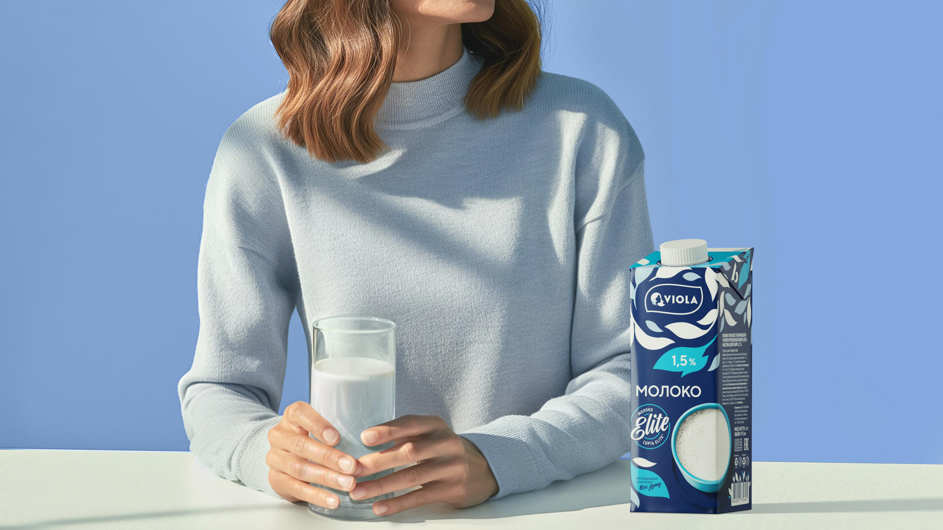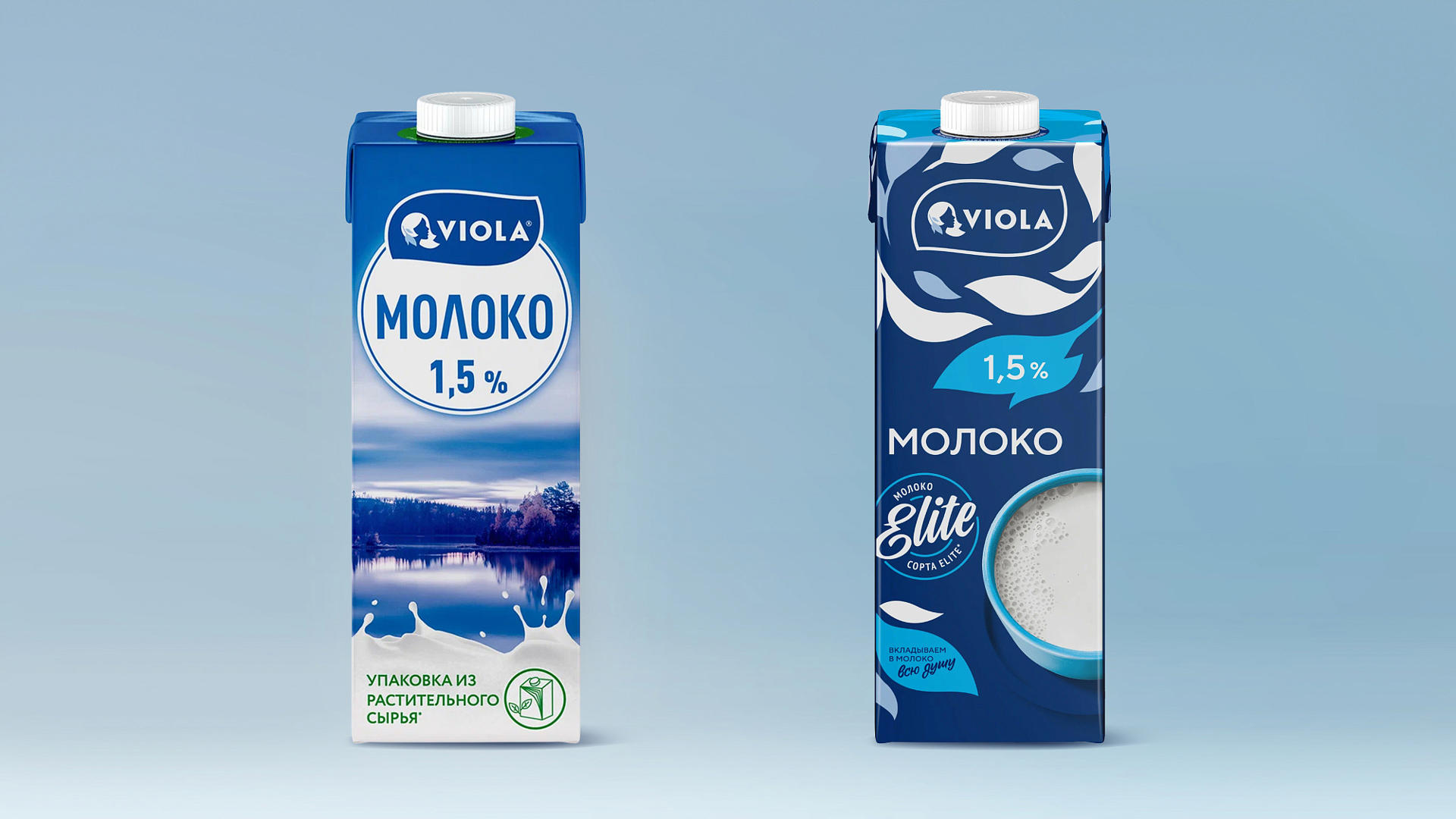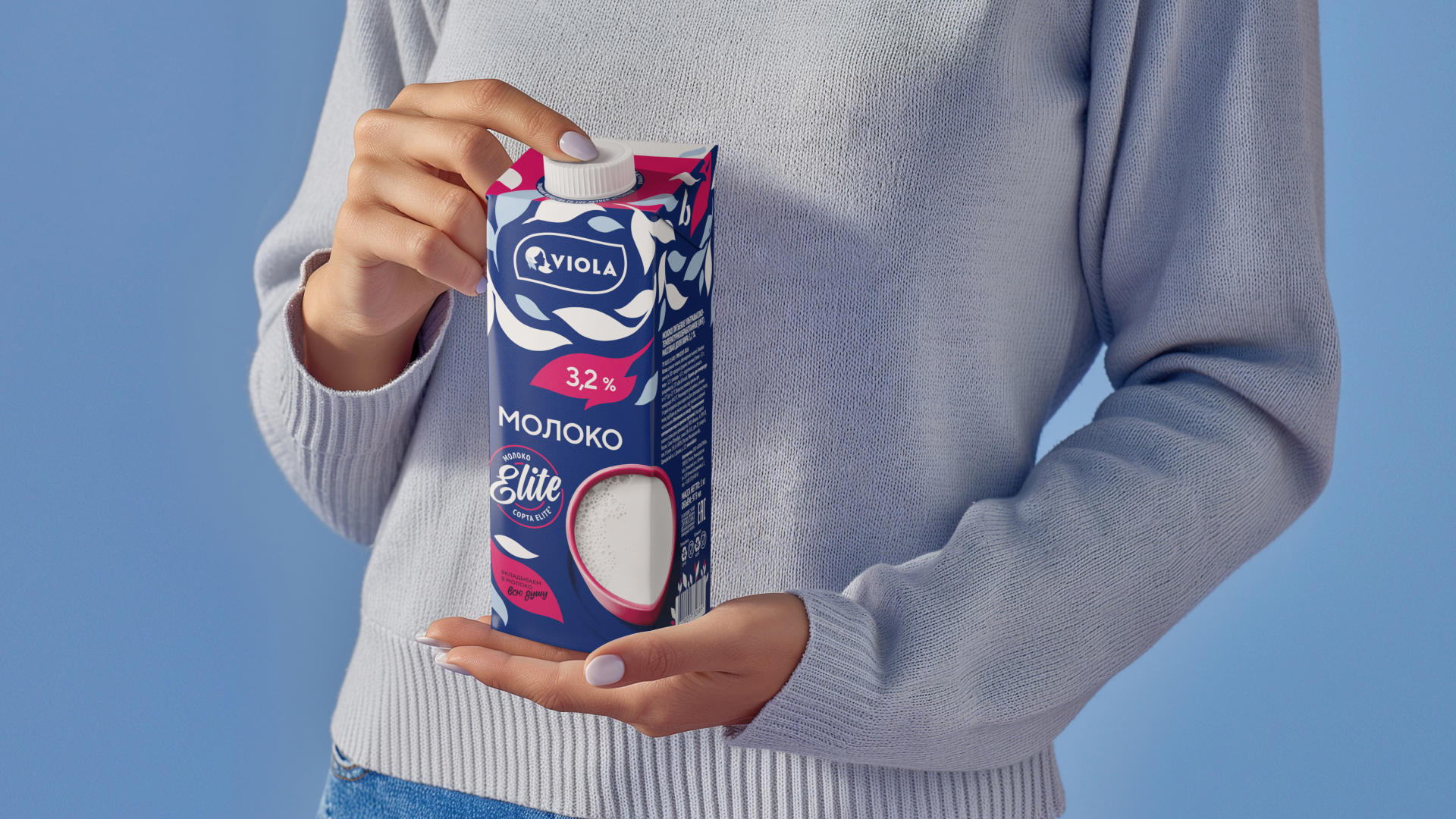 Новый визуальный стиль тонко передает идею легкости, натуральности и природного происхождения молочных продуктов Viola. Клейм Elite был переработан и теперь четко и ясно доносит до потребителя информацию о высоком качестве молока.