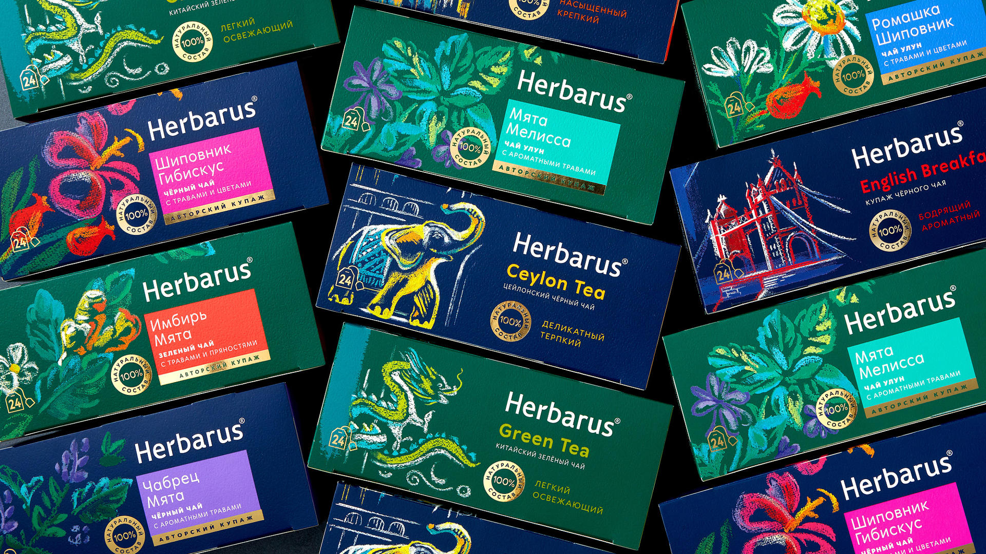 Herbarus — премиальный бренд чая, ориентированный на современных потребителей, ценящих здоровье и осознанный выбор. Начав с травяных купажей, бренд создал узнаваемый, деликатный визуальный язык, который стал его сильной стороной. Однако расширение ассортимента — появление черного и зеленого чаёв, в том числе с натуральными добавками — потребовало обновления. Важно было органично вписаться в существующую экосистему Herbarus, сохранив её премиальность, но при этом начать уверенно конкурировать на основной чайной полке, где доминируют крупные игроки.