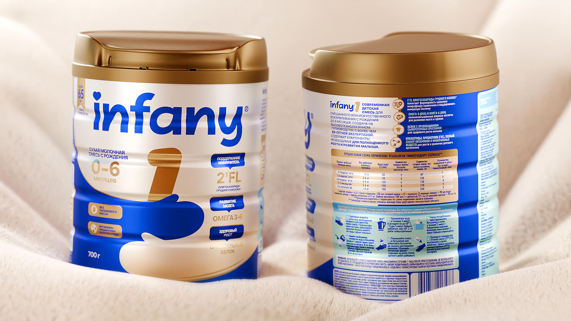 Визуальный язык упаковки получился современным, лаконичным и визуально теплым. Дизайн намеренно избегает излишней строгости, традиционной для категории, что позволяет Infany заметно выделяться на полке. При этом важная информация о продукте и его научно обоснованных преимуществах не потерялась — сложные термины были переработаны в простые и понятные формулировки, размещенные на упаковке без визуального шума.