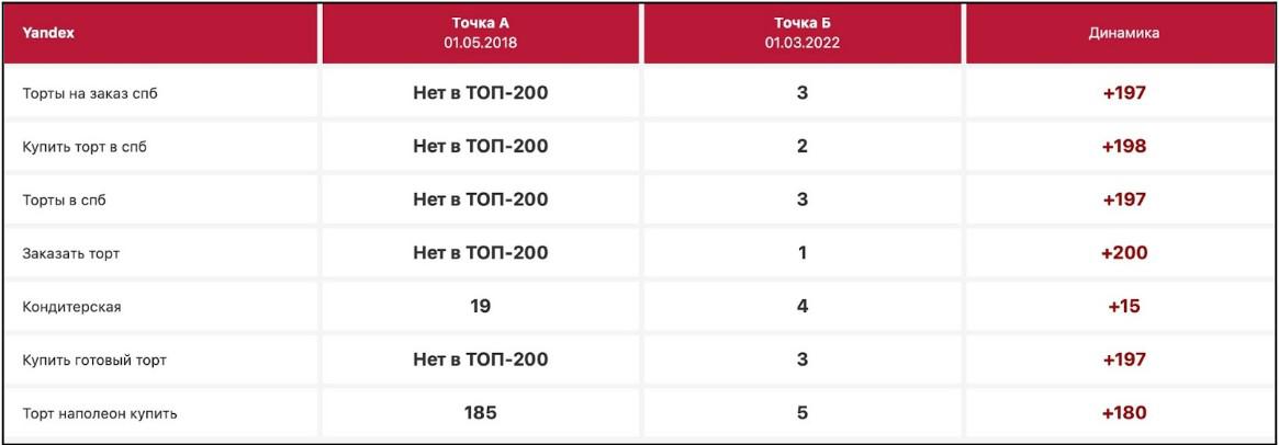 Примеры продвигаемых запросов и динамика позиций. Изображение предоставлено агентством Demis Group с сайта https://www.demis.ru/.