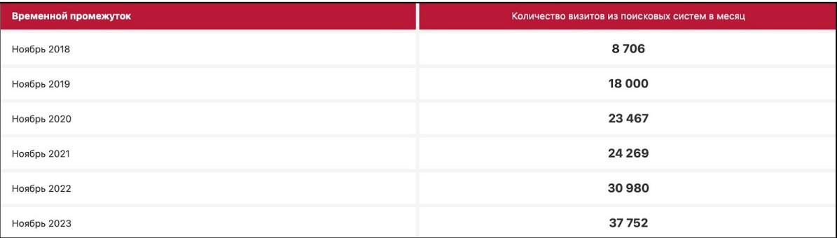 На старте продвижения в мае 2018 года сайт кондитерской привлекал 5 685 посетителей из поисковых систем. К ноябрю 2023 года число визитов выросло до 37 752 — в 6,6 раз.