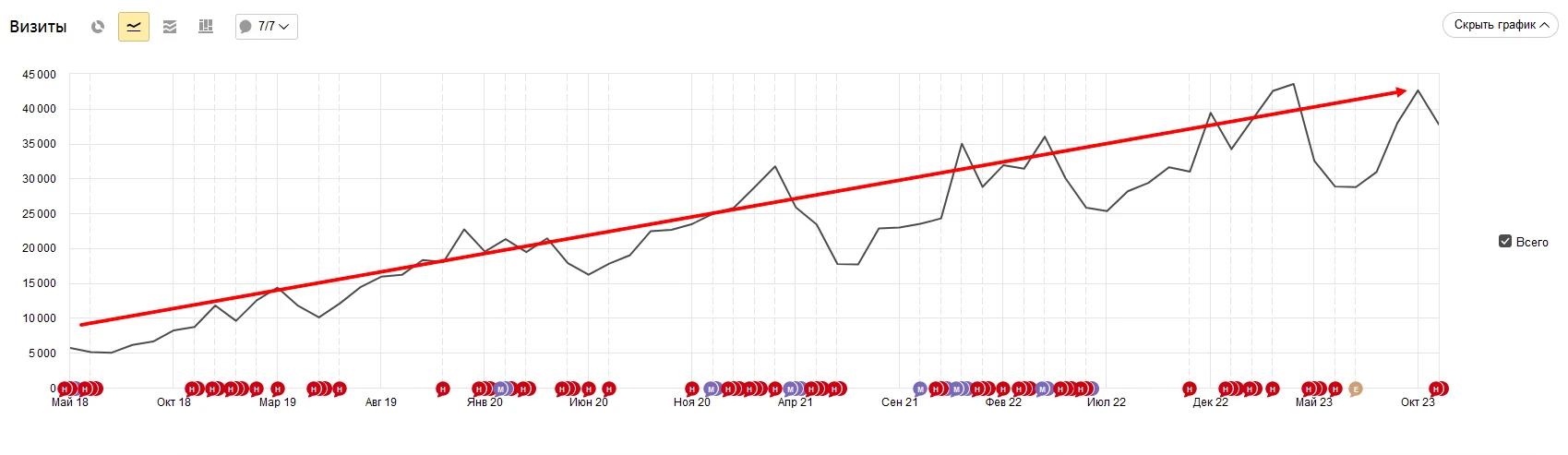 Рост посещаемости сайта с момента старта работ Demis Group: май 2018 — ноябрь 2023. Изображение предоставлено агентством Demis Group с сайта https://www.demis.ru/.