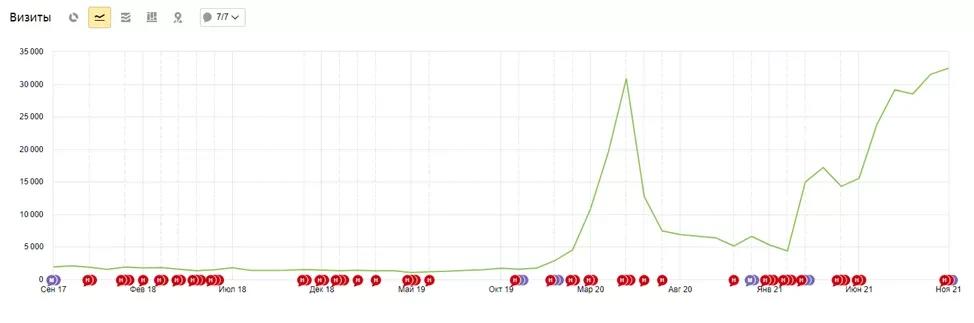 В мае 2021 года при полном редизайне сайта сторонним подрядчиком были допущены критические ошибки, из-за которых позиции по ряду запросов резко упали, а трафик в июне заметно снизился. После их исправления и внедрения комплексной SEO-стратегии сайт начал демонстрировать устойчивый рост посещаемости из поисковых систем.