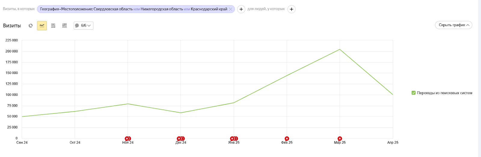 Для региональных филиалов клиент сотрудничал с партнерами, согласовывая добавление бренда и контактной информации в карточки товаров. Такая гибридная схема позволила не только улучшить видимость сайта, но и значительно увеличить поток посетителей из регионов.