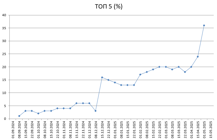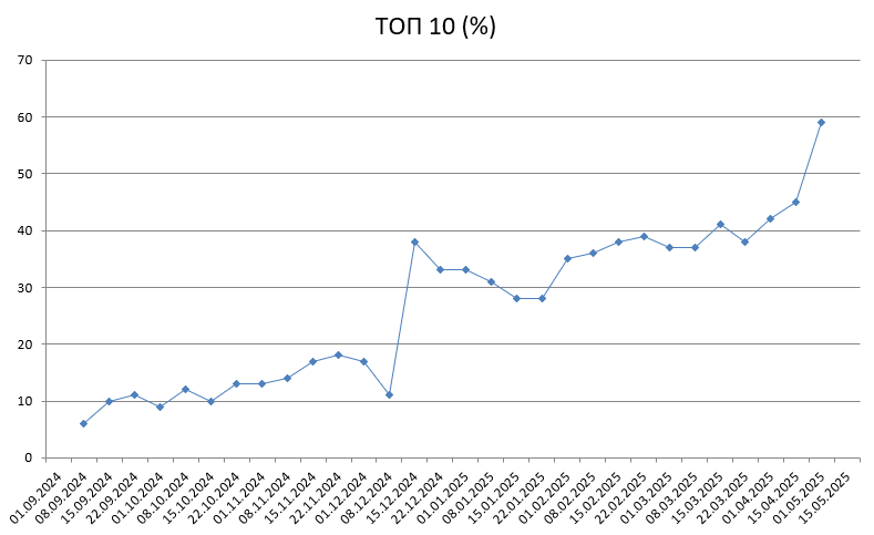Продвижение велось по двум семантическим ядрам, охватывающим свыше 12 000 ключевых запросов. Постепенно каждая ключевая фраза выводится в топ, что заметно увеличивает видимость ресурса. Особенно ярко это проявилось в регионах: по 98 % локальных запросов сайт уже занимает лидирующие позиции.
