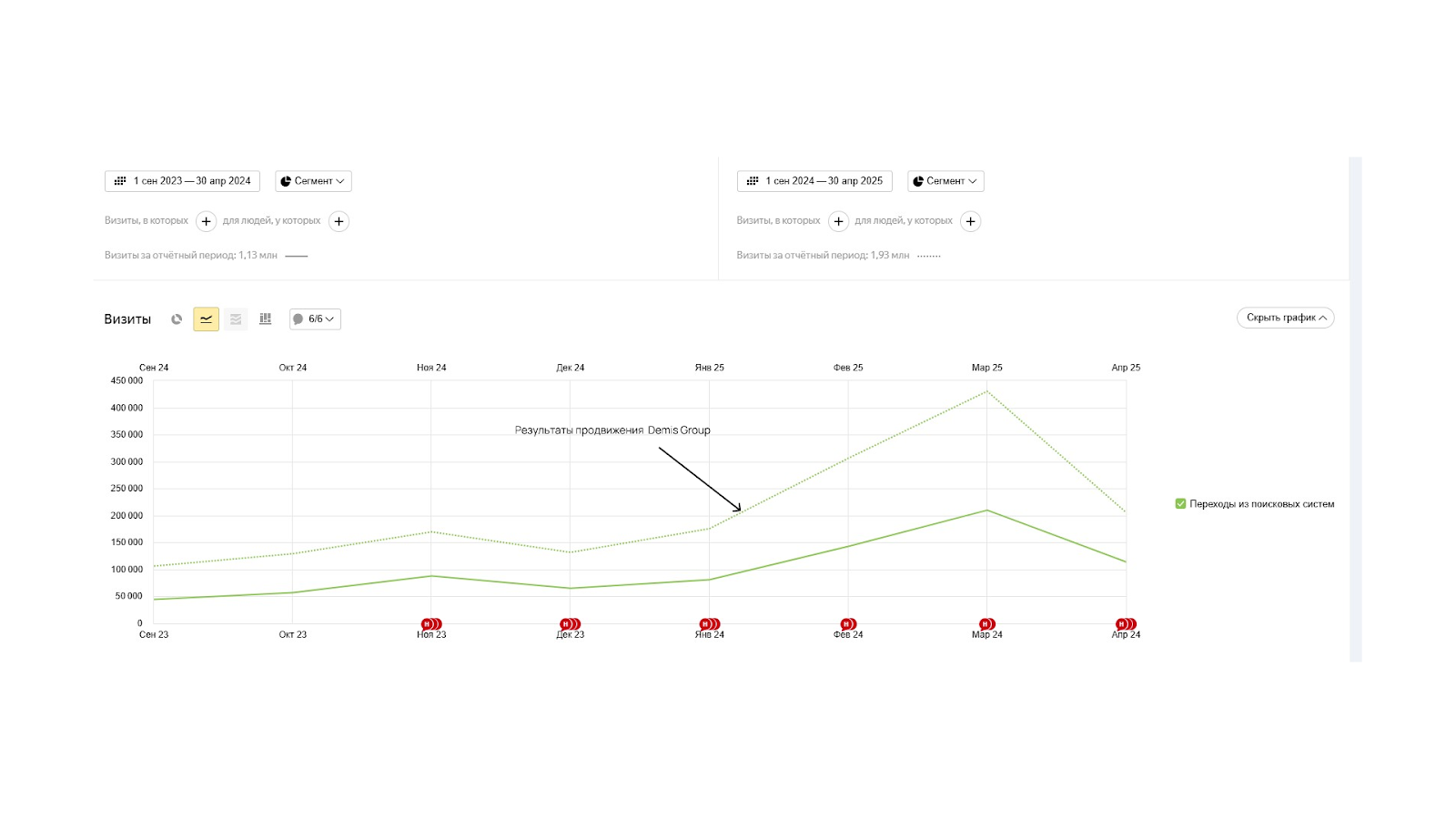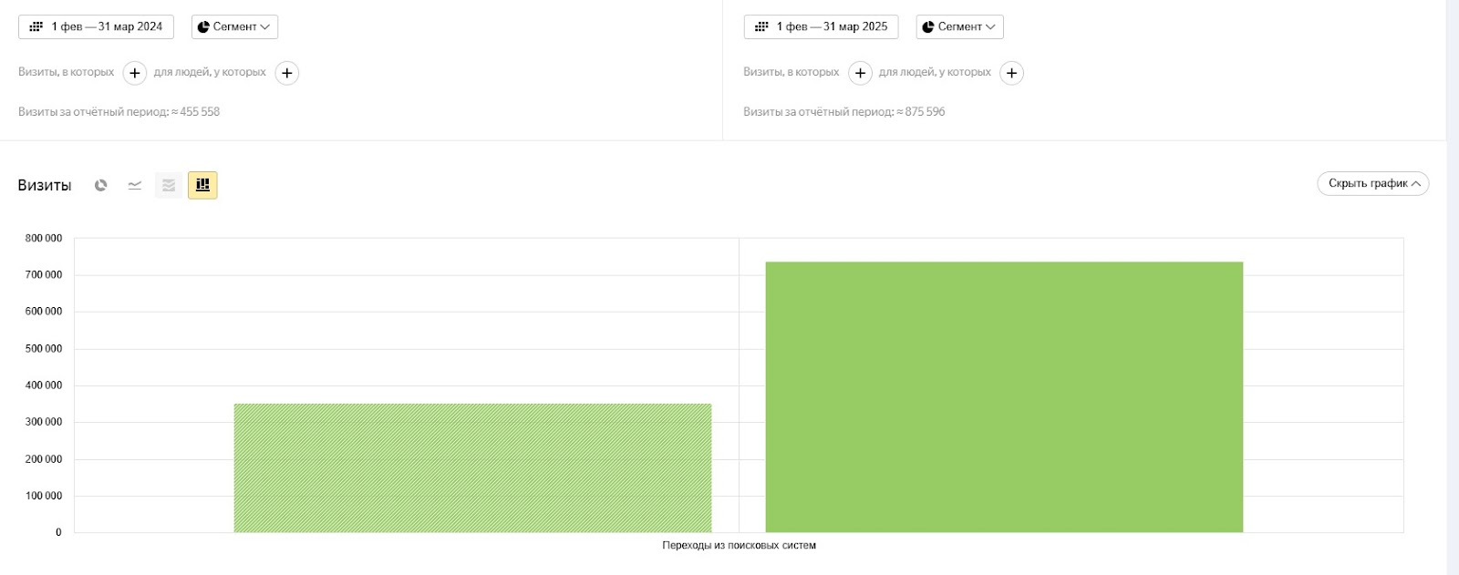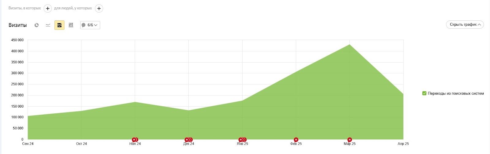 С сентября 2024 по апрель 2025 года трафик сайта удвоился до 205 721 визитов. А в марте посещаемость достигла 430 385 визитов.