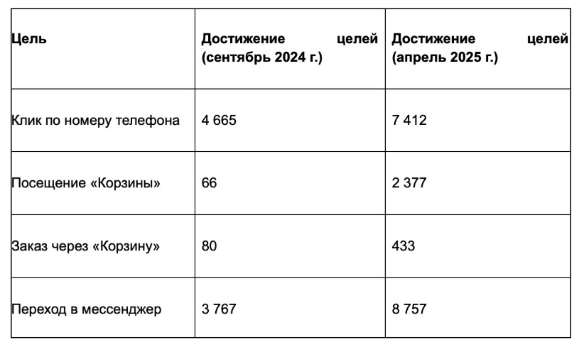 - Рост конверсий и взаимодействий. Цель — не просто привлечение пользователей, а стимулирование реальных действий: оформление заказов через корзину, звонки и обращения в мессенджеры.