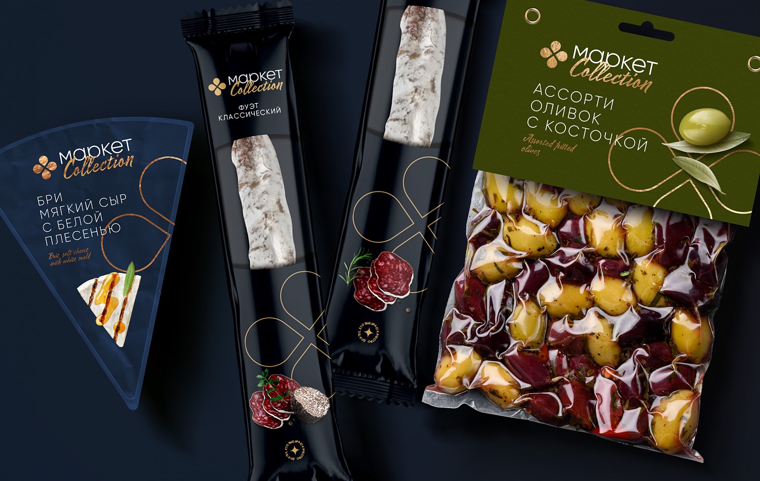 Собственная торговая марка премиум-класса «Маркет Collection» теперь имеет благородное цветовое решение и яркую фудзону. Вдобавок структура упаковки некоторых товаров бренда была пересмотрена – в неё добавилось пленочное окно. Сквозь пленку покупатели сразу могут оценить качество таких категорий товаров, как: бакалейная продукция, кулинария, рыба и мясо. Кроме того, новая упаковка позволяет предохранить продукты от повреждения.