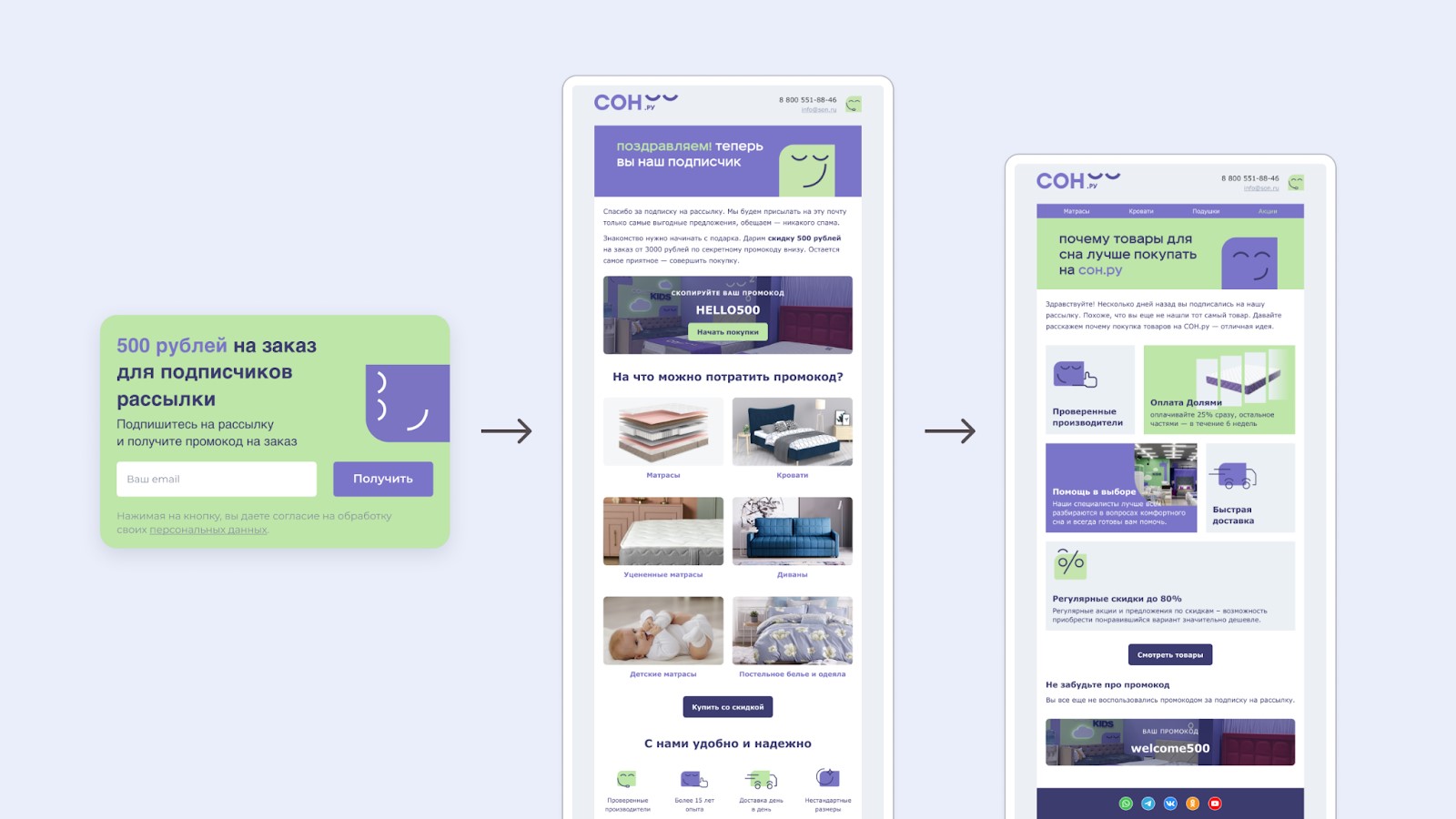 На следующем этапе на сайт СОН.ру был установлен скрипт, позволяющий отслеживать поведение пользователей. Это позволило собирать информацию о действиях клиентов на сайте, таких как просмотры товаров, добавление в корзину и другие важные события, которые стали триггерами для email-рассылок. - Внедрение попапа для сбора базы подписчиков