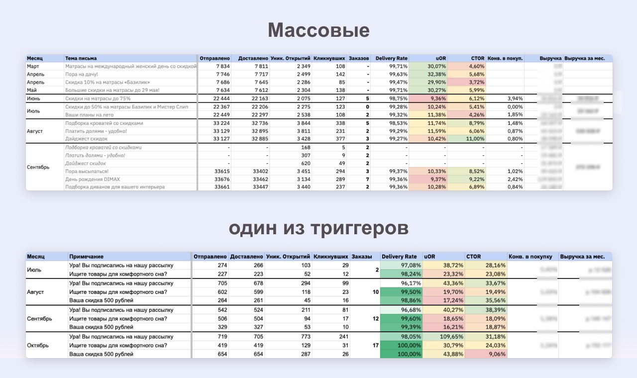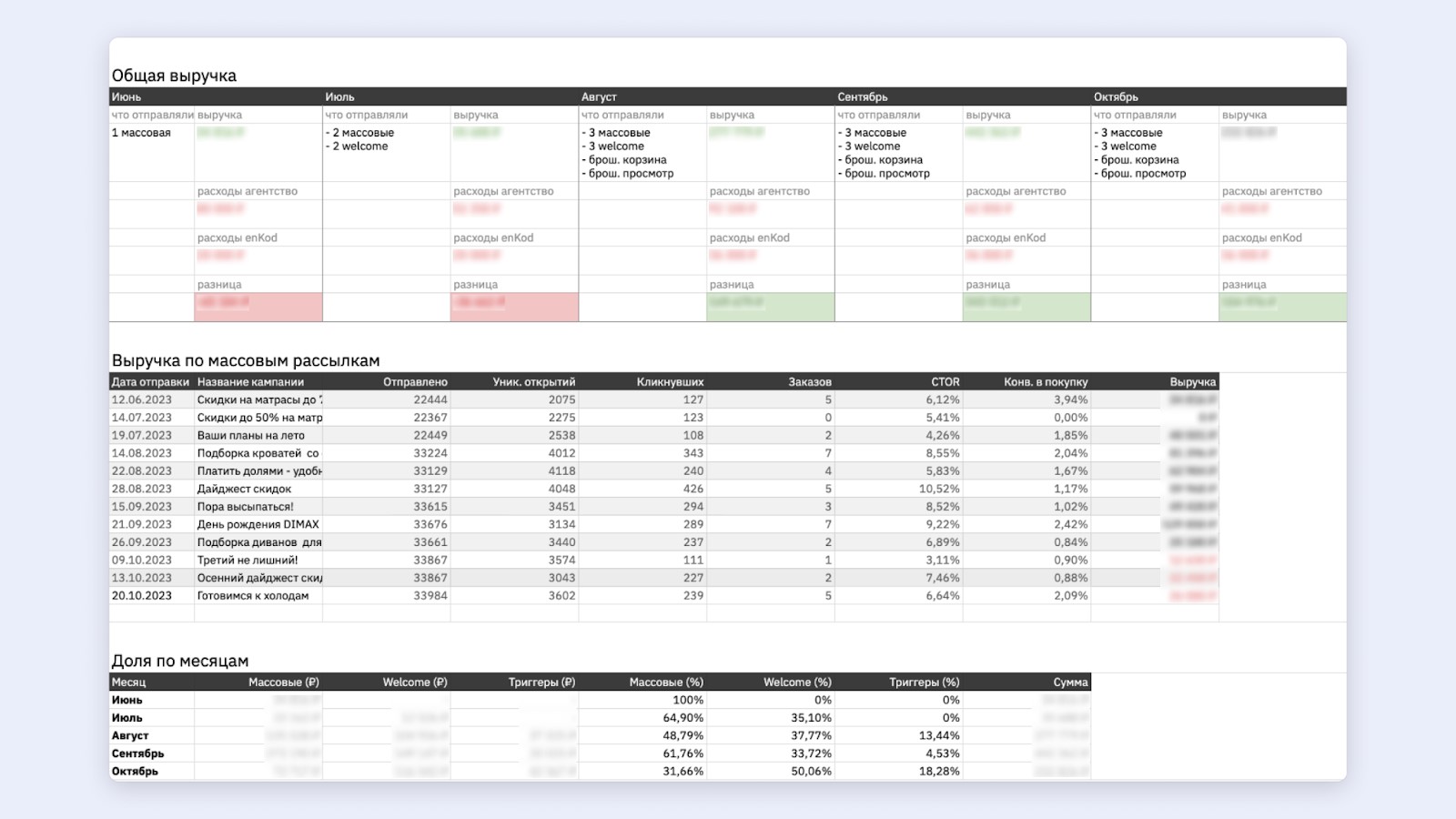 Для контроля за эффективностью email-канала и всех триггерных цепочек, агентство разработало детализированную систему отчетности в Google Таблицах.