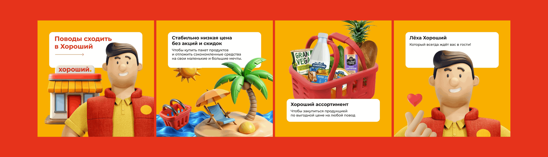 Главный персонаж — 3D-маскот Лёша Хороший, знакомый покупателям по офлайн-коммуникациям. Мы вывели Лёшу в digital и сделали его центральной фигурой визуального сторителлинга.