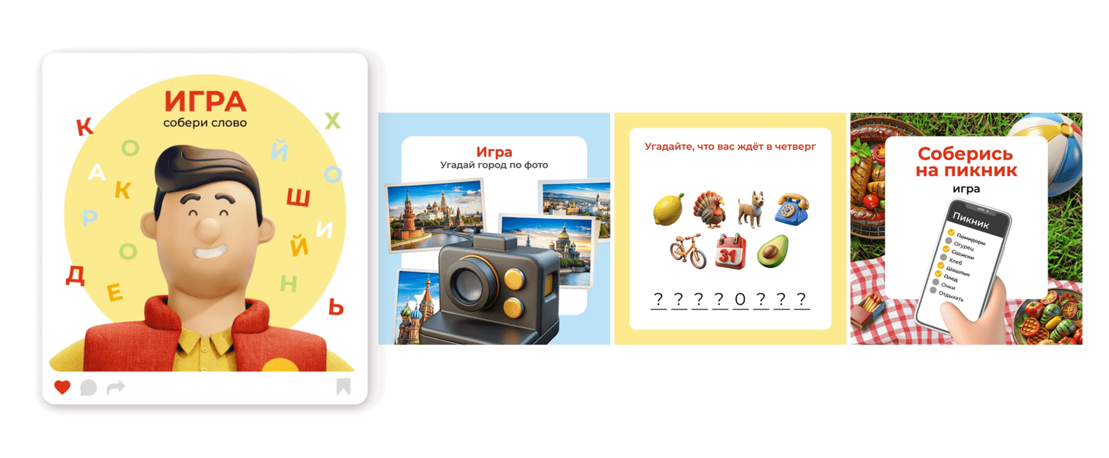Игры, тесты и опросы — формат, который оживляет ленту. Подписчики активно участвуют, комментируют и соревнуются, а бренд становится частью их повседневного настроения.
