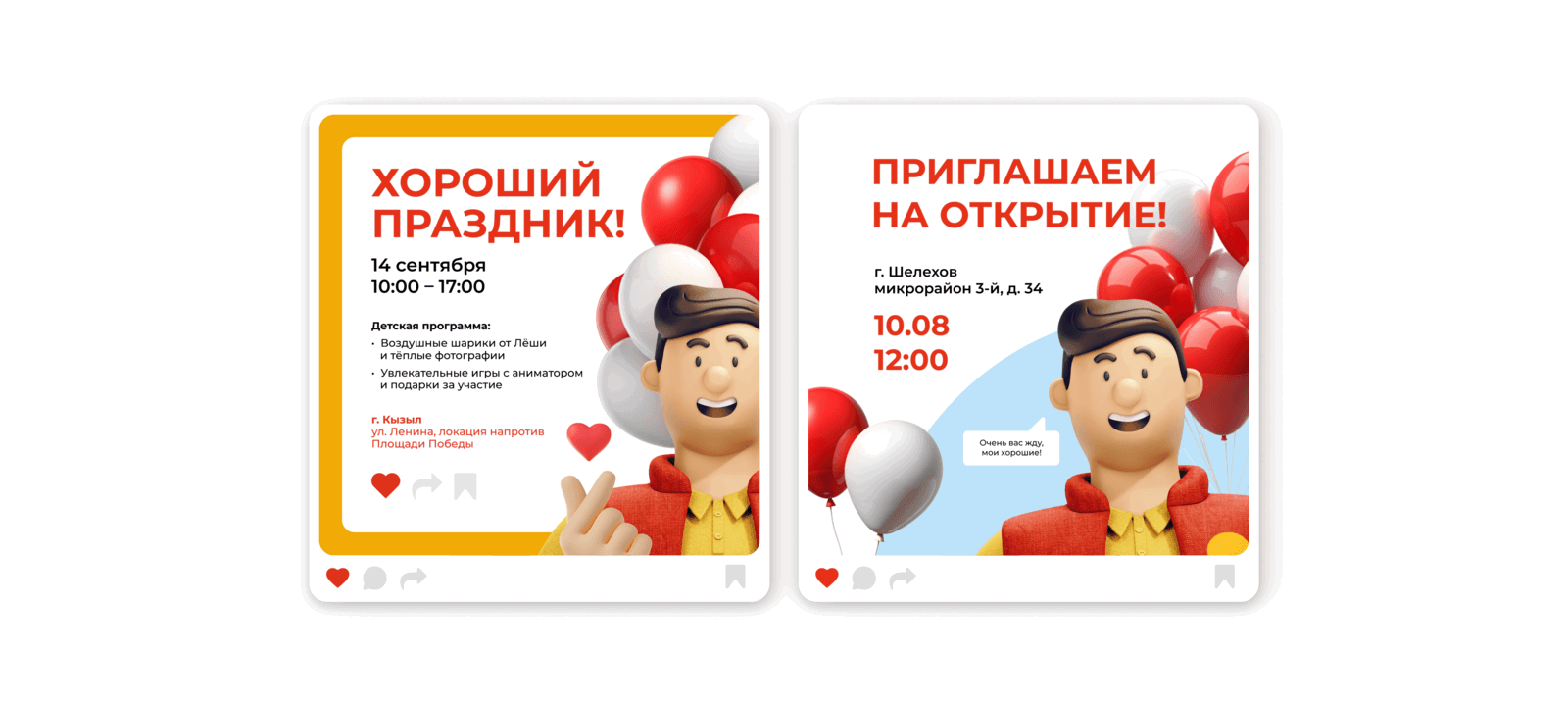 Рассказываем о событиях сети — открытия, дни рождения, праздники. Яркие макеты с Лёшей и праздничными элементами создают ощущение радости и близости.
