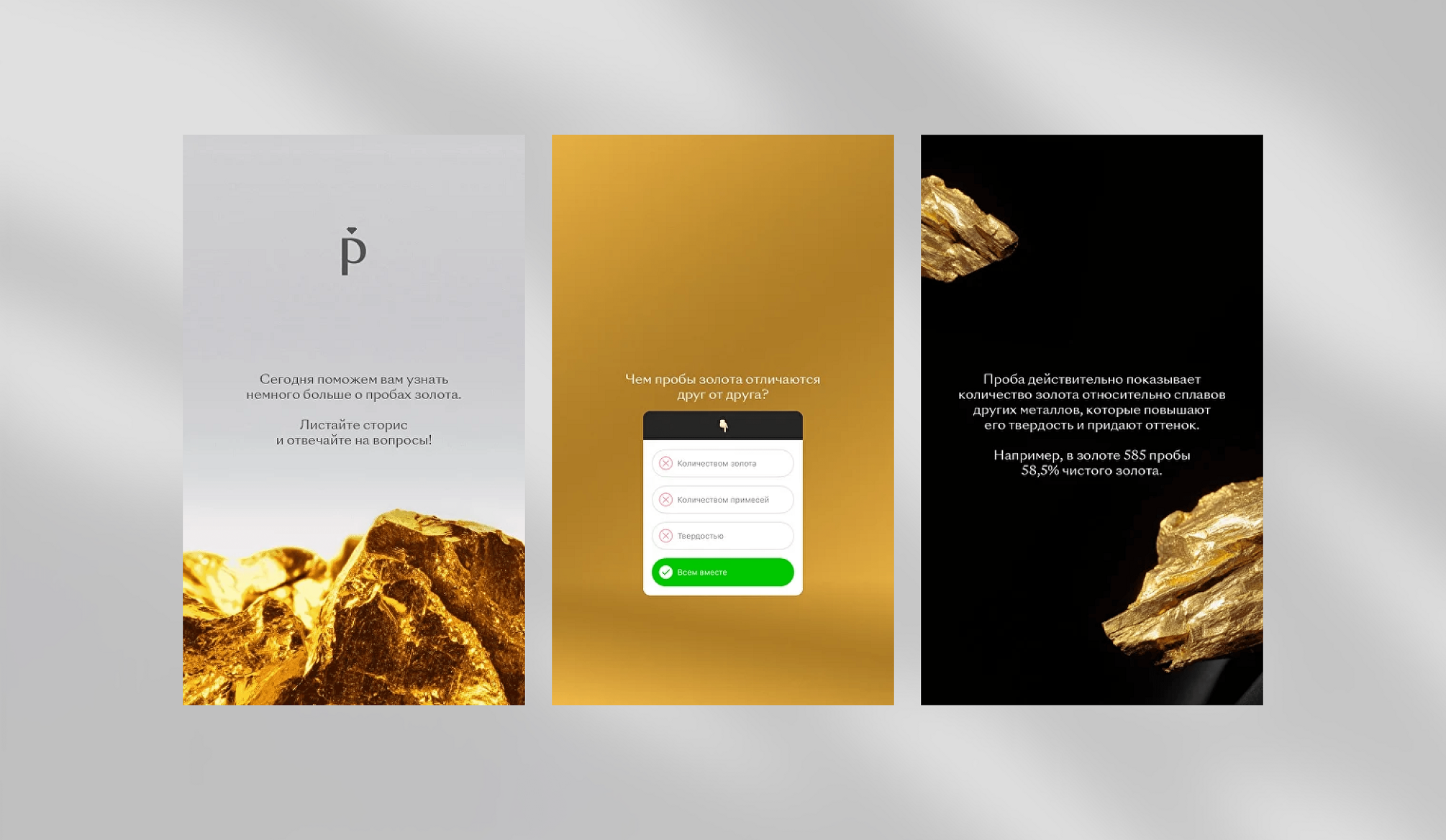 Для постоянного вовлечения аудитории была запущена еженедельная рубрика в stories. Подписчики получали советы по уходу за украшениями и узнавали новое о драгоценных металлах, камнях и их огранках. Чтобы сделать процесс увлекательным, команда FABRIKA agency добавила викторины и тесты — интерактивные элементы, которые органично встроились в общую стратегию.