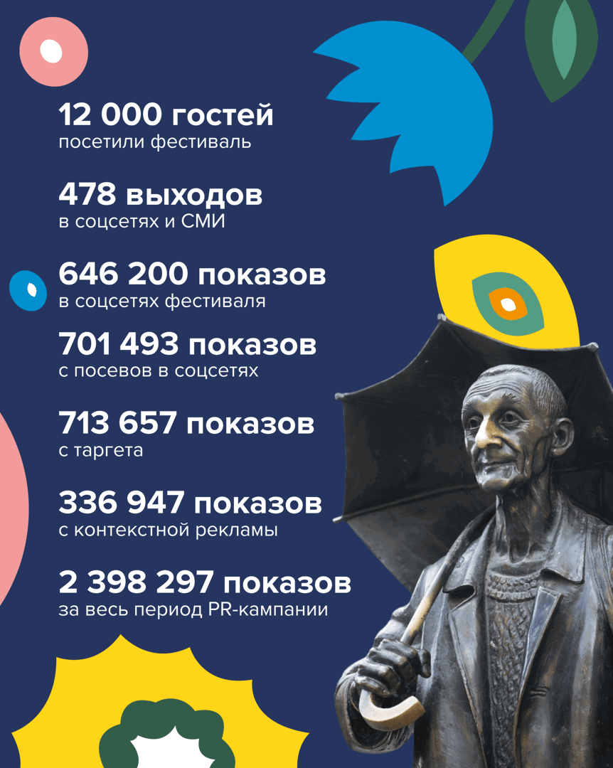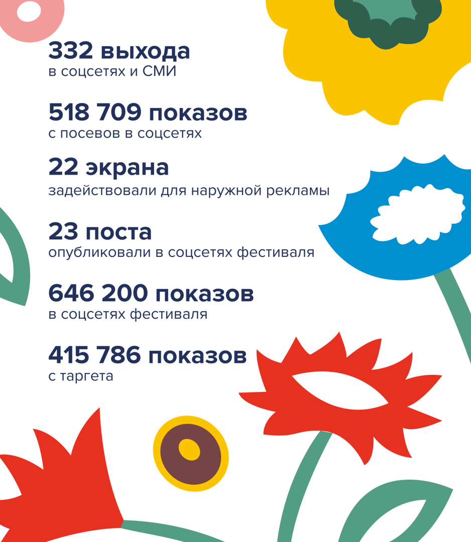 В результате было получено 332 выхода в соцсетях и СМИ, 518 709 показов с посевов, 646 200 показов в соцсетях фестиваля 415 786 показов с таргета.