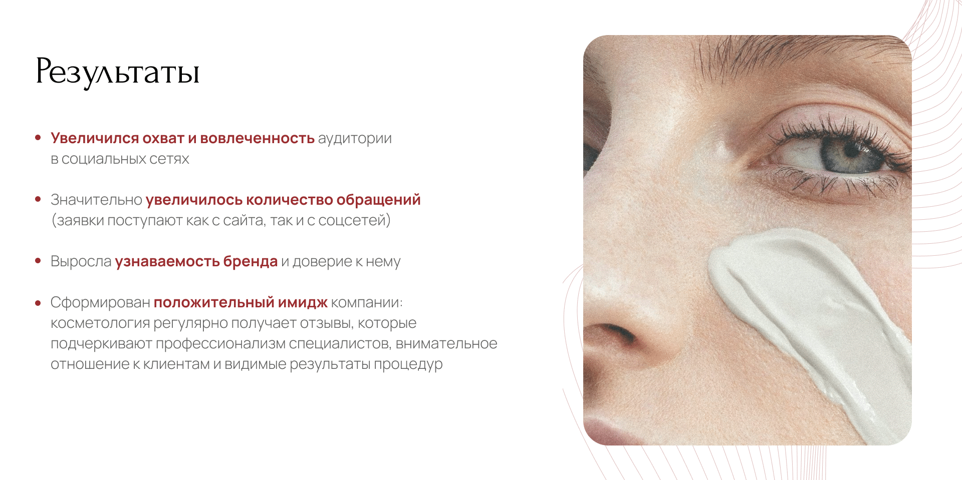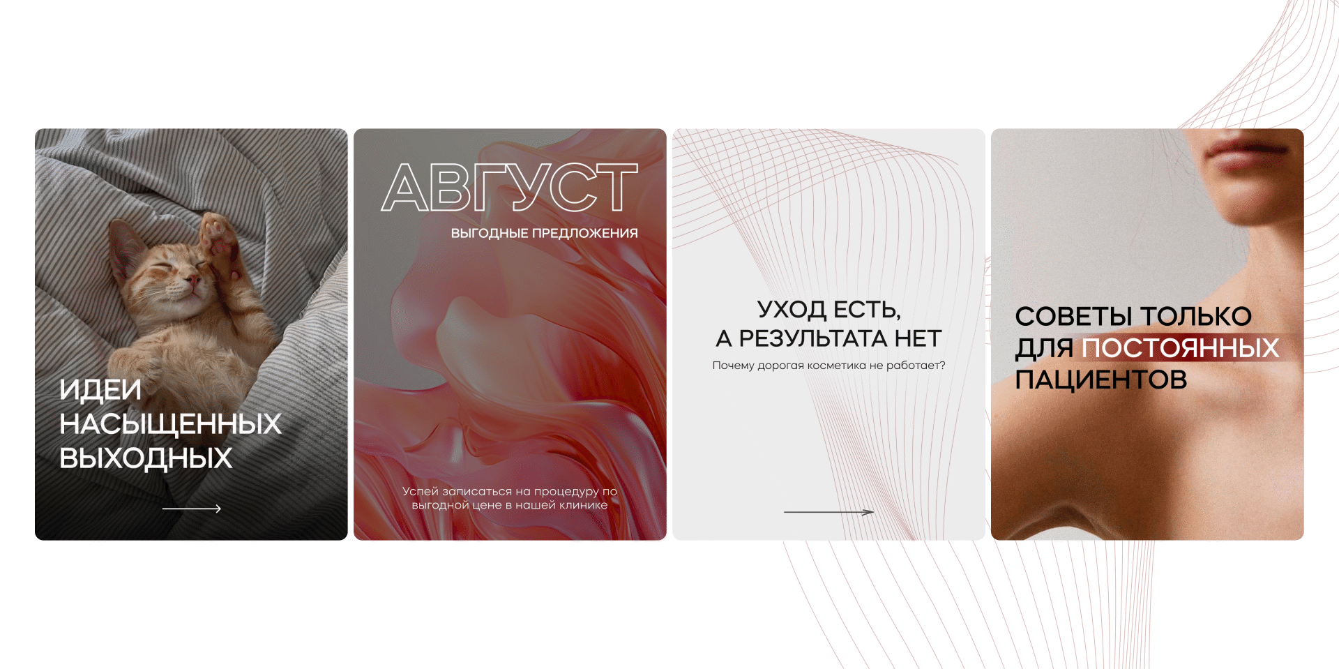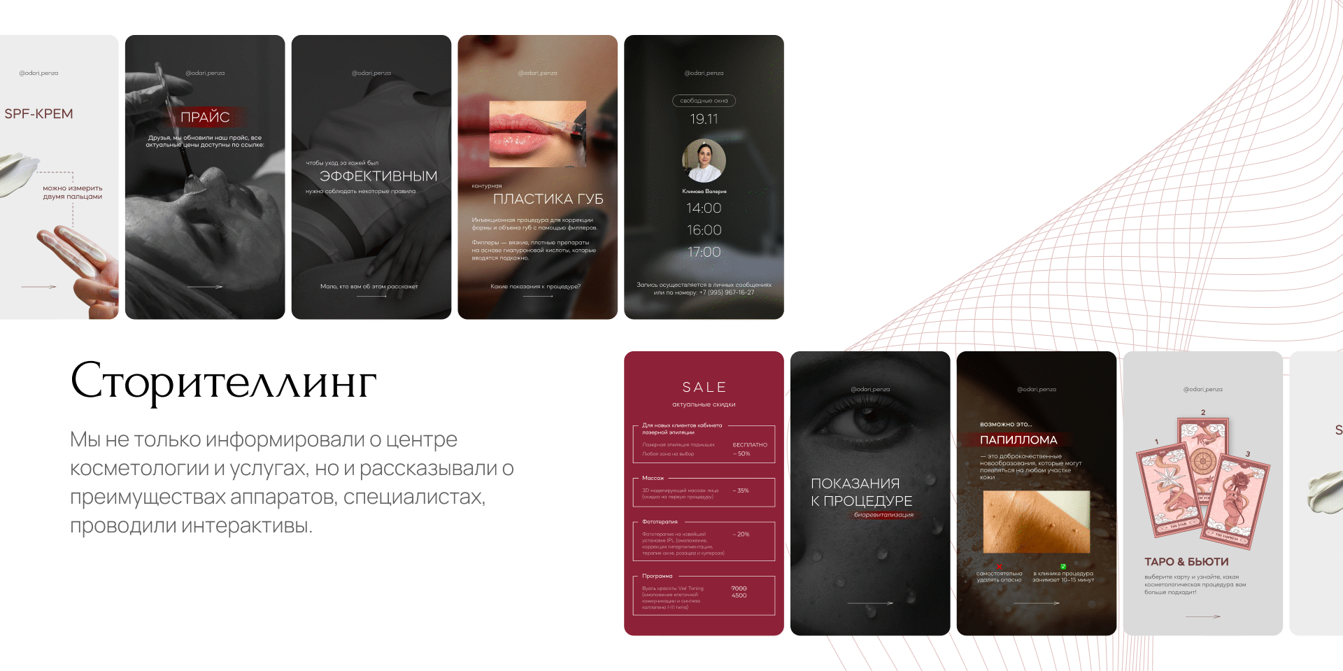 Использовали сторителлинг: рассказывали о специалистах, аппаратах и процедурах, проводили интерактивы и закрывали типичные возражения через контент.
