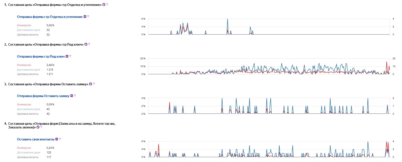 Важно отметить, что специалисты изменяли оферы на лендингах под конкретные рекламные кампании, а также тестировали различные варианты наполнения лендингов, виды форм для сбора контактов.