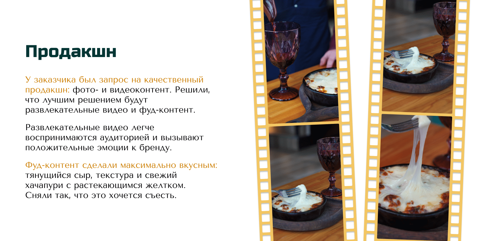 - На аппетитной подаче блюд: демонстрировались характерные текстуры, тянущийся сыр, хачапури прямо из печи — все, что вызывает желание «съесть глазами».