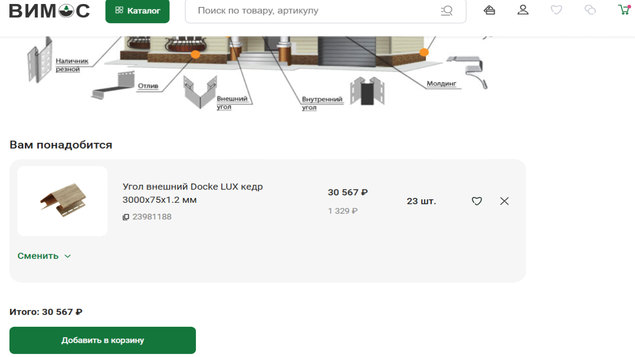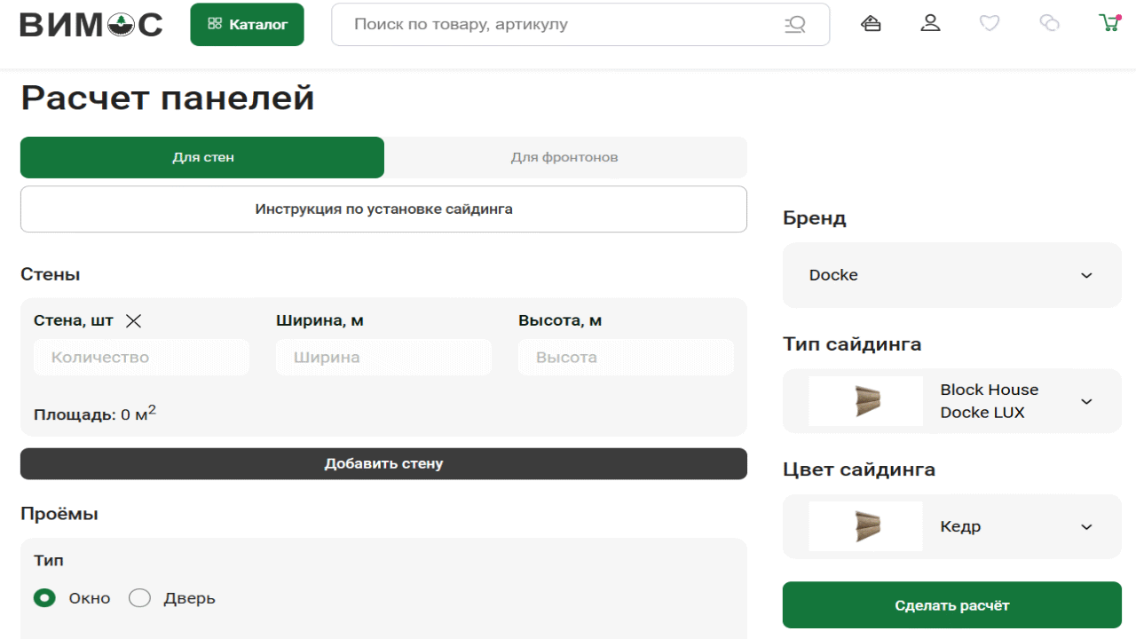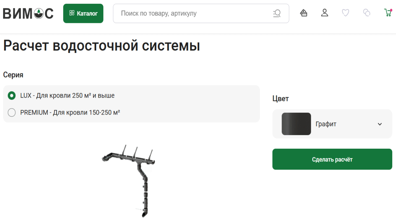 Это крайне практичная фишка для сайта строительно-отделочных материалов и хозяйственных товаров. Покупателю часто сложно подобрать количество и объем товаров «на глаз», а подобный калькулятор в «Вимосе» помогает избежать ошибок и привлекает новых клиентов своим удобным применением.