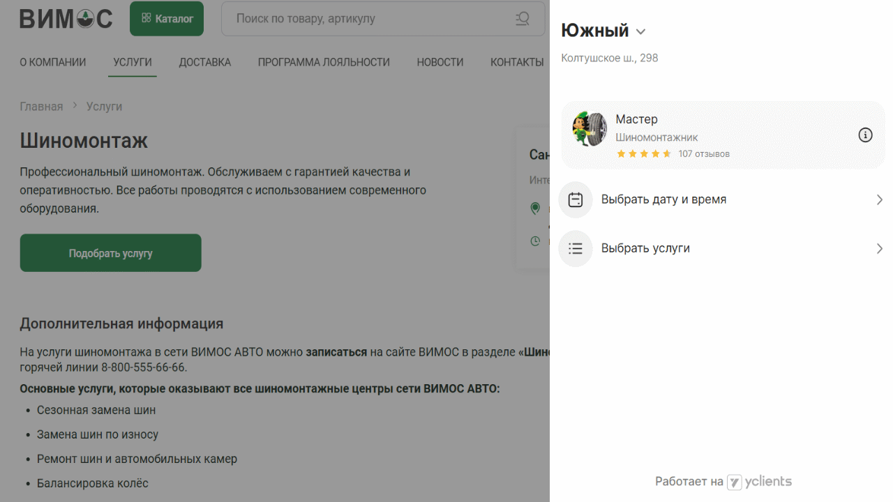 На сайте и в приложении реализовали отдельный сервис записи на шиномонтаж (в тех точках, где услуга доступна): выбор мастера, времени, параметров — и заявка уходит напрямую в точку обслуживания. Это усиливает единство системы и помогает монетизировать оффлайн-услуги через цифровой сервис.