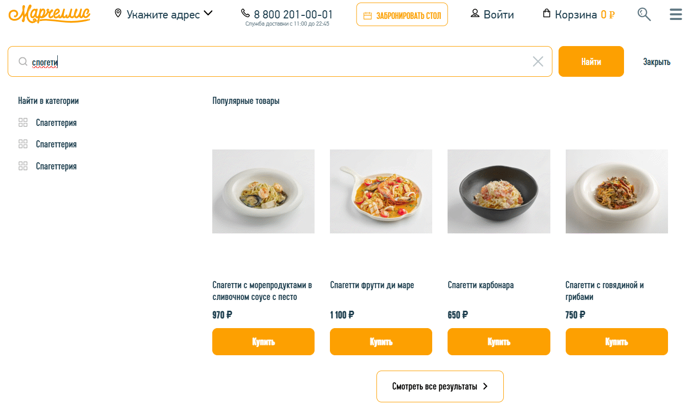 На сайте был внедрен интеллектуальный поиск DigiNetica — система, которая понимает пользовательские запросы даже с ошибками и предлагает релевантные результаты. Это особенно важно для доставки, где скорость выбора напрямую влияет на желание клиента остаться в конкретном ресторане и оформить там заказ.