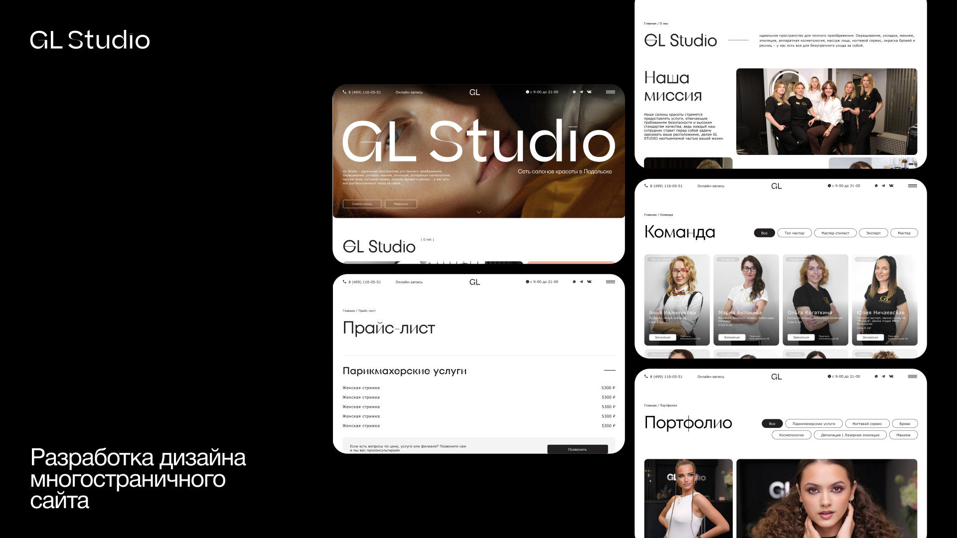 Параллельно агентство разработало официальный сайт GL Studio. Особое внимание было уделено удобству пользователя и эстетике интерфейса. Сайт стал не только витриной услуг, но и инструментом продажи: клиенты могут изучить направления, ознакомиться с работами мастеров, узнать цены, записаться онлайн и получить консультацию. Структура сайта выстроена так, чтобы подчёркивать преимущества студии и создавать ощущение премиального сервиса уже на этапе знакомства.