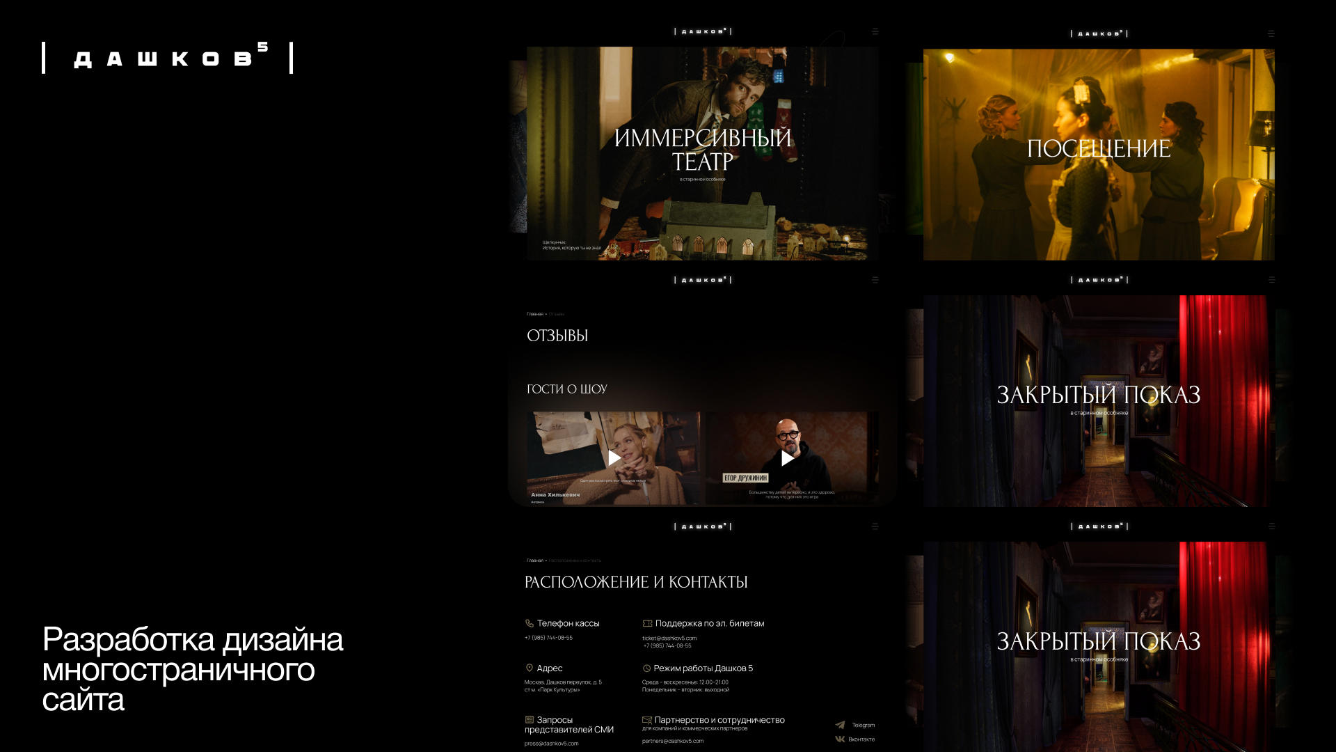 Услуги по брендингу для «Дашков 5» — первого репертуарного иммерсивного театра в России, расположенного в историческом четырёхэтажном особняке. Театр создает уникальный формат взаимодействия со зрителем: каждый спектакль — это путешествие в новый мир, где драматургия, пространство и чувства соединяются в единую живую реальность. Гости перемещаются по залам, погружаясь в атмосферу, созданную через хореографию, ароматические композиции, свет, звук, предметные декорации и игру актёров, которая складывается для каждого в индивидуальную историю.