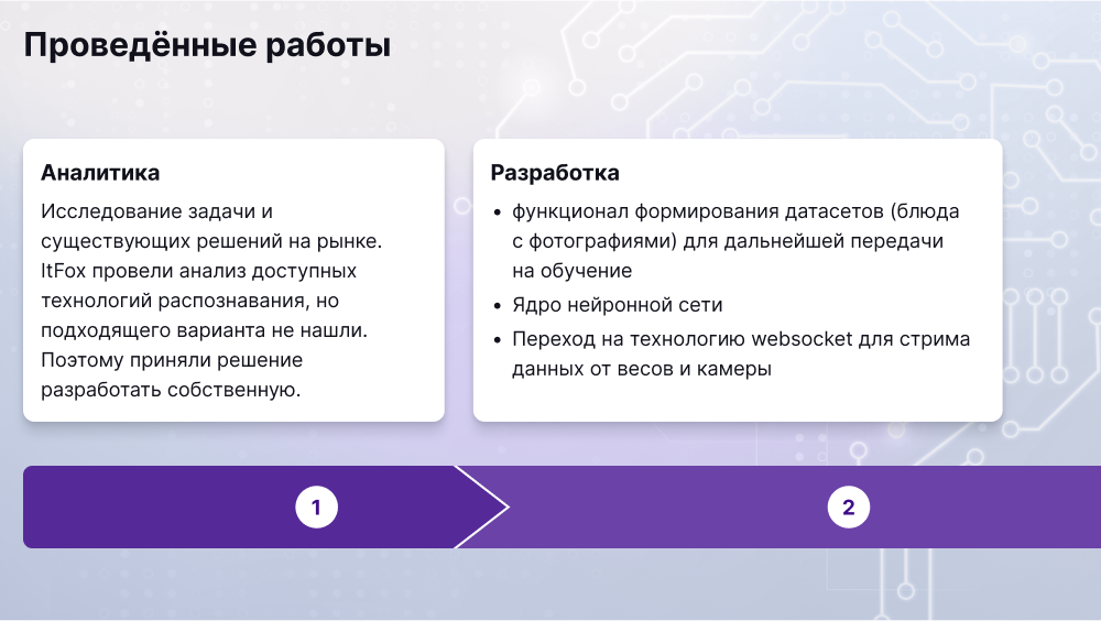 1. Аналитика. ItFox провели исследование доступных технологий распознавания, но подходящего варианта не нашли. Поэтому приняли решение разработать собственную.