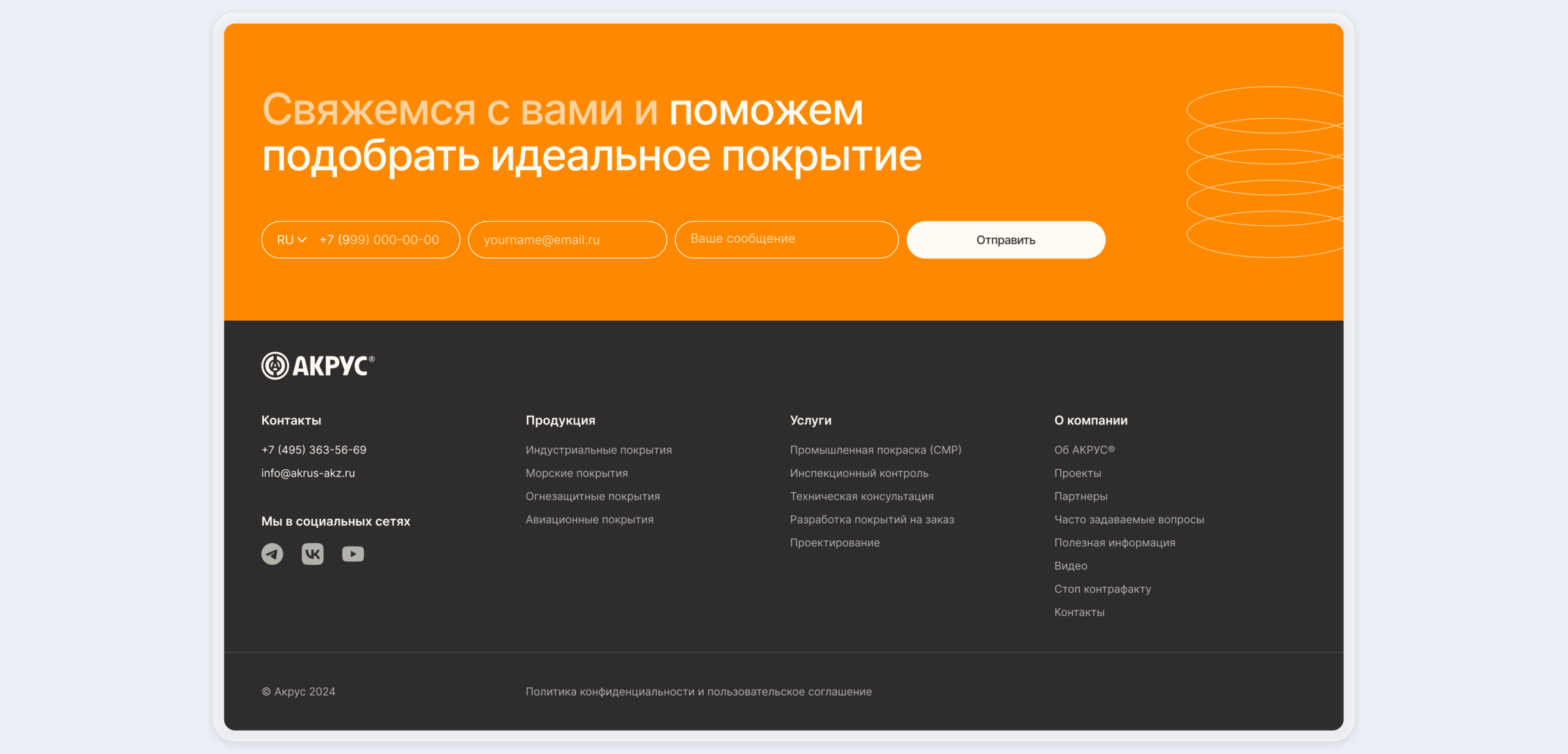 Редизайн помог бы «Акрус» не просто обновить внешний вид, а превратить сайт в полноценный инструмент продаж: удобный, современный, вызывающий доверие. Компания с таким сайтом выглядела бы в онлайне так же солидно, как и в реальной жизни.