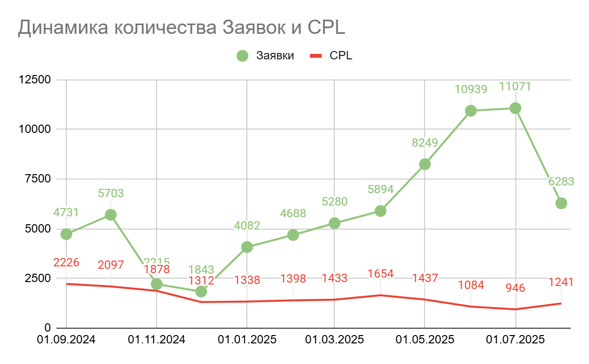 - CPL снизился до 1400 ₽ (на старте был ~2200 ₽).