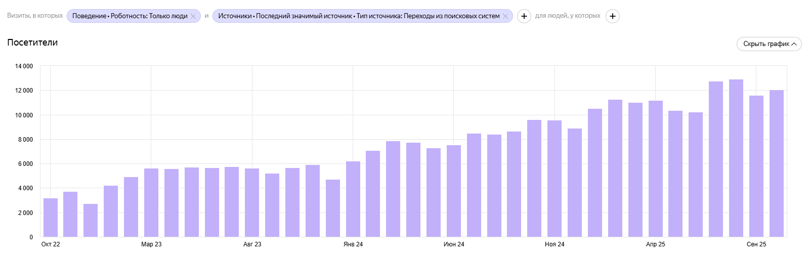 В ноябре 2025 года работа над проектом продолжается: семантическое ядро постоянно обновляется, контент расширяется, постепенно внедряются новые UX-решения, укрепляя позиции клиники в регионе.