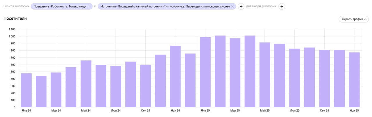 - Среднее количество посетителей сайта в месяц выросло более чем в 3 раза, достигая 1013 пользователей в пиковый период.