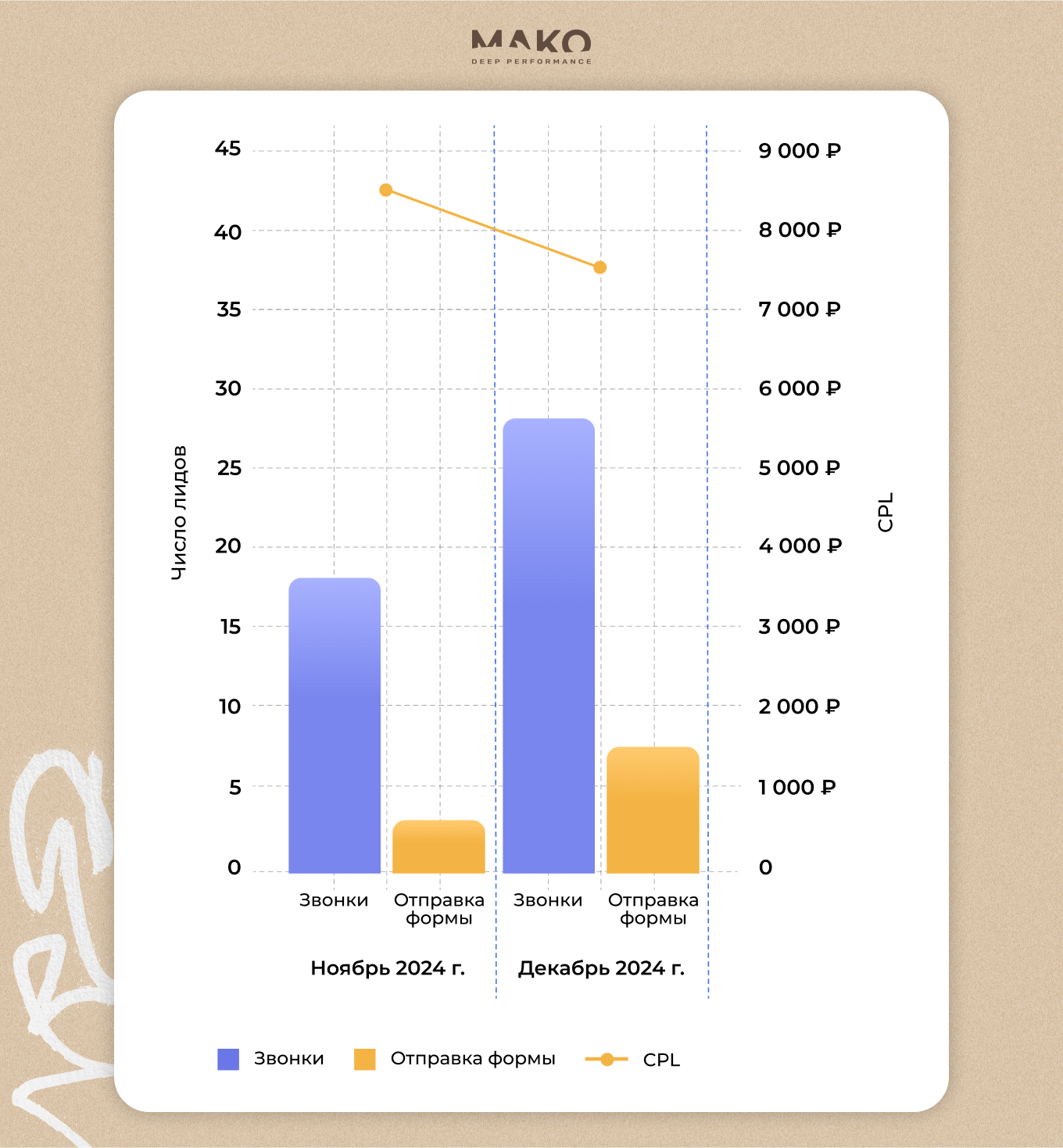В декабре получено 35 лидов со средней стоимостью лида (CPL) — 7 626 рублей. Для сравнения, ранее фабрика получала 21 заявку при CPL в 9 855 рублей.