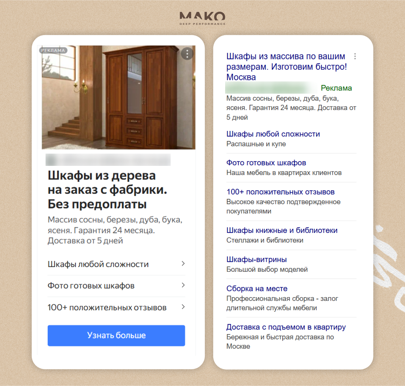 - Повышение релевантности объявлений. Креативы адаптировали под ключевые запросы целевой аудитории. Акцент сделали на главные преимущества: «из дерева», «на заказ», «по вашим размерам», указали виды массива. Отдельно выделялось УТП компании: «без предоплаты», «доставка за 5 дней».